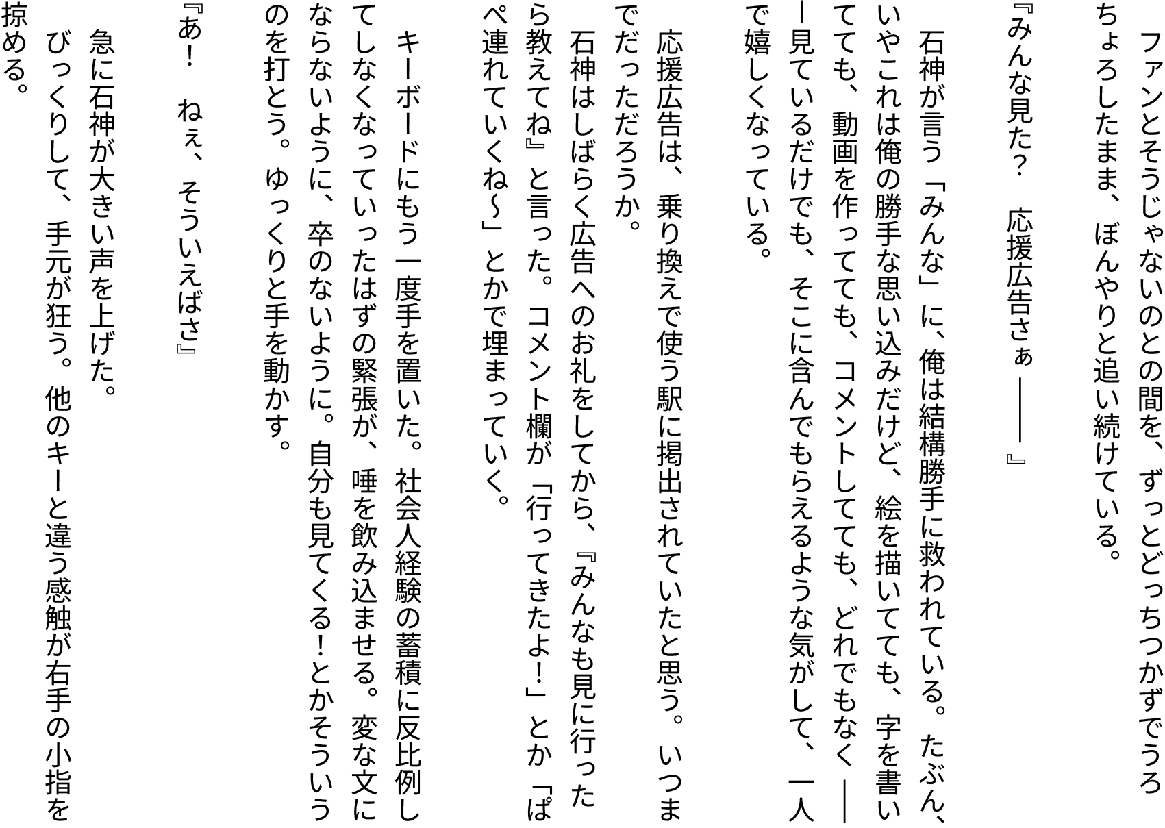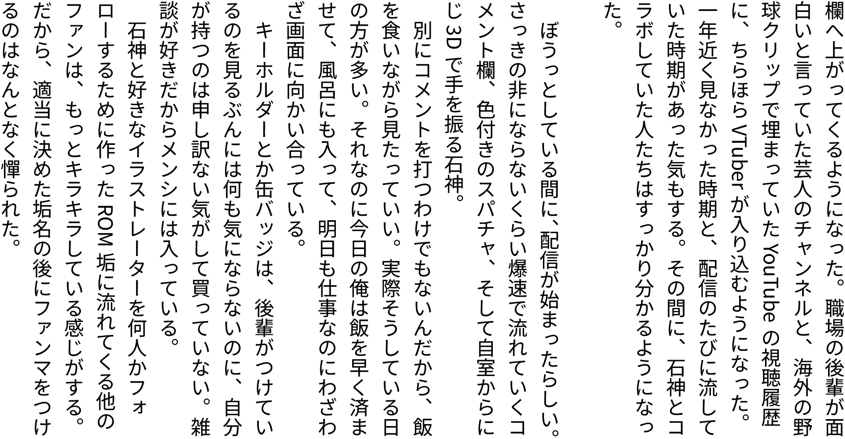 - 最高を更新し続ける石神さんの軌跡とリスナーへの思今年は特にしっかりデートしてるし石神っていつもオタクを思いやってくれるからオススメできる。いが優しくて涙腺にきます。